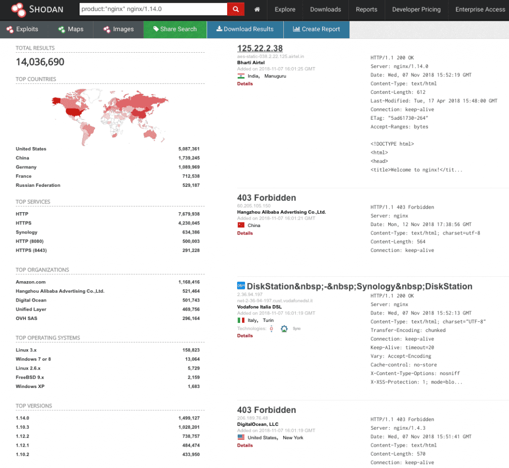 目前,Shodan 搜索显示超过 1400 万台服务器运行未包含修复补丁的 nginx 版本(更确切地说是 14,036,690 台),仅有 6992 台服务器打上了安全补丁。
