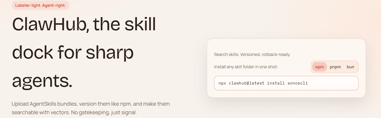 先去 https://www.clawhub.ai/ 浏览热门/ trending,看安装量和作者。