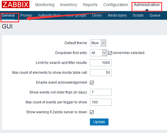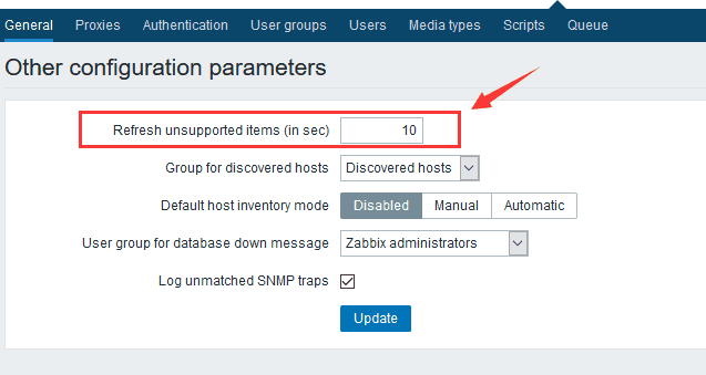 修改zabbix监控项刷新时间 2018年4月10日 zhangdd 90 0 评论 zabbix linuxzabbix日常 zabbix的默认刷新不支持的监控项目的时间是600秒,有时候会感觉我修改了一些东西,怎么还不刷新,于是重启agent 重启server端,最后发现是这个参数起作用 在这里修改 Administration-general 右上角下拉菜单 ,不是这个blue哦,往右看 有个GUI 就这货 下拉选择 其他 other 修改刷新不支持的监控项目 值改为10秒 本文声明: 本文出自张佃栋de博客,转载时请注明出处及相应链接。 永久链接: https://zhangdd.com/8.html 最后编辑: 2018/04/10 ©著作权归作者所有 赞 0 分享 上一篇 windows系统Tomcat启动过程中找不到JAVA_HOME解决方法 下一篇 修改CentOS默认yum源为国内yum镜像源