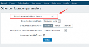 zabbix的默认刷新不支持的监控项目的时间是600秒,有时候会感觉我修改了一些东西,怎么还不刷新,于是重启agent 重启server端,最后发现是这个参数起作用 在这里修改 Administration-general