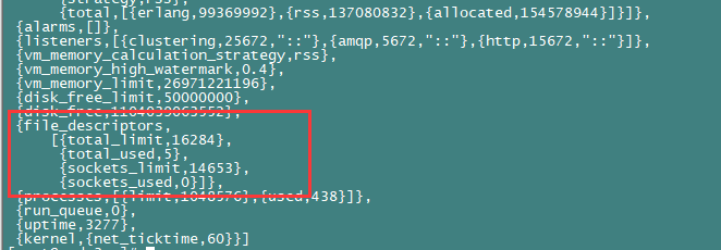 在系统中执行“rabbitmqctl status”,可以看到file_descriptors和sockets的详细信息,如图: